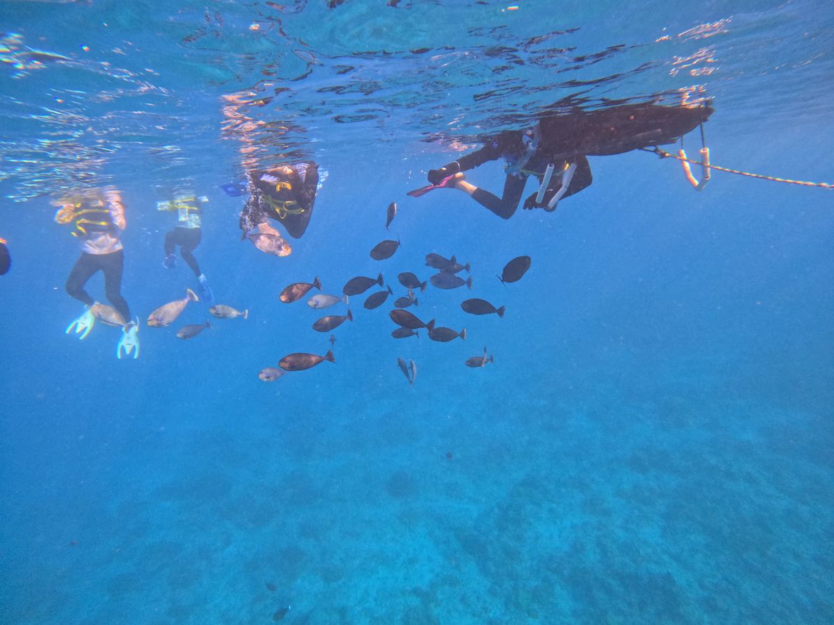 しばらくするとシュノーケリング体験に移ります!(ウミガメ見れます!)最後にはソーセージを餌に魚を集めて写真撮ることもできます!