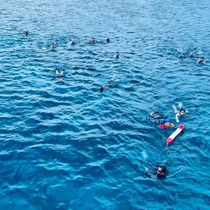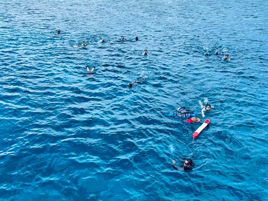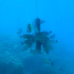 一緒に海に入ってくれるスタッフさんについて行くと餌をまいて魚を集めてくれます。私たちは遅れてしまったのであまり見られませんでしたが、近くで見ることをお勧めします。時々サメも来ていたようです。