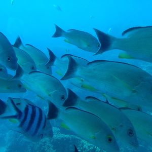 慣れているのですね〜。他にも、名前のわからない細長〜い、リュウグウノツカイみたいなお魚もつがい?でいて、グアムでのシュノーケリングを本当に楽しめました。