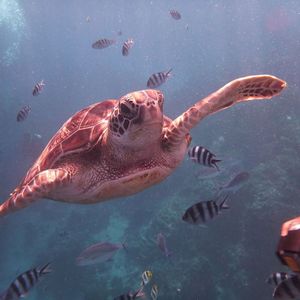 ayami様 この度は、ご結婚おめでとうございます!\(^▽^)/ 大切な記念のご旅行に、当フィッシュアイにお越し下さりありがとうございました。美しい海を安心、安全にお楽しみ頂けるツアーですので「いい経験ができました!」と仰って頂きとても嬉しいです。なお念の為ですが、ウミガメは野生種にてこちらから積極的な接触はせず、カメの方から近づき過ぎてきた場合に優しく方向を変えてあげるという感じで皆様にお願いしております。