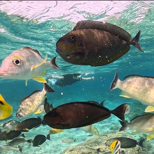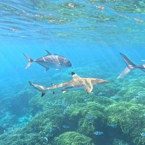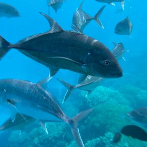巨大なアジ(オニヒラ・カスミ・ロウニンアジなど)の群れとサメが展望塔の周りを泳いでいて、間近で観察できて良かったです。インストラクターがまいた餌にアジやサメが群がる姿はとても迫力がありました。また行きたいです。