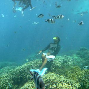 ただ我々はシュノーケルと海に慣れているので十二分に満足できたのですが、他の方で一部コメントがあった通り、海に入る前にはそれなりの<覚悟>が必要かと思います。というのも、ライフジャケットはつけてはいるので絶対に体は沈まないのですが、水深が10メートルはある所を泳ぐんです、これは一旦入ってしまえば慣れると思いますが、慣れていない方からすればほぼ間違いなく恐怖で躊躇すると思います。(10メートルはかなり深いですよ、想像より) これは決して悪い意味ではなく、こんな水深の、しかも自然の珊瑚が存在する場所でシュノーケルできることなど珍しいと思いますのでそれなりの心構えがあればどんな方でもダイビングでなく、シュノーケルだけで一生の思い出になるような体験が出来るという事です。