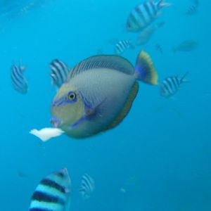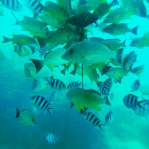 正直、海中展望台の周りをシュノーケルするので人工的なものですし、それなりの体験が出来れば、、という程度で参加しました(失礼! でも送迎コミで$39という低料金でしたしね。。) シュノーケルの説明のあと、展望台の下に降りて海に入る時にロープに捕まりながら入っていくのですが、入った瞬間に驚愕の光景に思わず叫んでしまいました! 自然の超大型の珊瑚がいくつも群生しており、強烈な数の魚が泳いでいるではありませんか。。珊瑚の近くに魚はよく寄ってくるのはある程度は知っていましたが、魚の数が尋常ではないですね、ここは。。こうゆう光景を竜宮城というのかな、、なんて感じながらシュノーケルをしていると付き添いのスタッフの方がイカの餌をくれ、ちぎりながら海に入れようとしましたが魚の寄ってくる数が多すぎて若干ひくくらいの感じで餌付けをした位です。