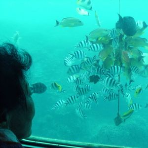ダイビングをする私は、海の中がきれいなことや、熱帯魚が多いことは知っていましたが、今回母76才と一緒にグアムに来ました。海中の魚に感動してもらいたいと思い、このオプションに参加。母は、泳ぎは苦手ですが、ライフジャケットがあるから大丈夫。折角南の島に来たのだから、海の体験を。と話して納得。まず、海中展望塔を見て、母も感動。次にシュノーケル。インストラクターのお兄さんスタッフが、母をしっかりアシストしてくれて、母も海の中が綺麗なことに感度し、もらった餌を左手に持って寄ってきた魚にさわることができたことに感動して、とても良いツアーになりました。防水カメラを持って行っていましたので、撮ってもらったり、カメラマンの人のカメラでも撮ってもらったりして、写真でも思い出を作ることができました。カメラマンの写真は、CDにしてもらい、購入。カード払いができました。バイキングもおいしかった。シュノーケルでお腹がすくので、昼食付きにして正解。日本スタイルで、水を出してくれるので、ドリンクを必ず注文しなくてもよいのも魅力です。シャワーもホットシャワーでgood。当日は、凄い雨だったのですが、海の中は安定していて、魚が綺麗でした。母も大喜びでした。母のアシスト、ありがとうございました。