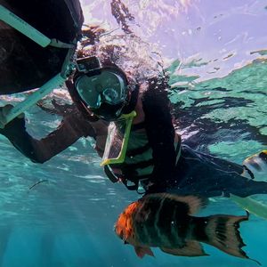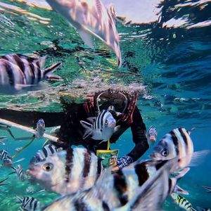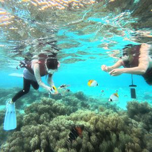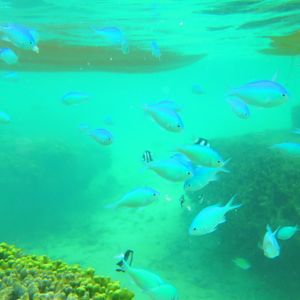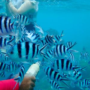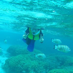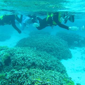 最初は足のつかない所からのスタートに怖いかもと思ったのですが、すぐに慣れて海の中を楽しむ事ができました。餌を撒いてくれるので海面近くに沢山魚が寄ってきて楽しかったです。ホテルから浜辺への送迎付きで安心して満喫できました。