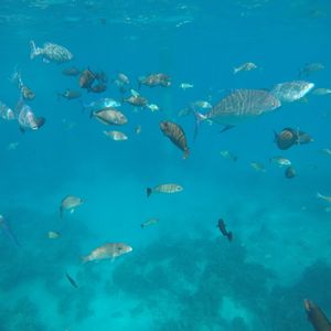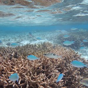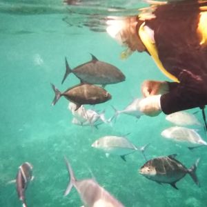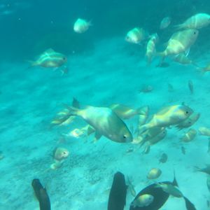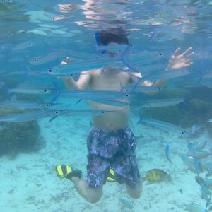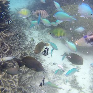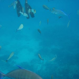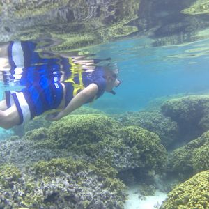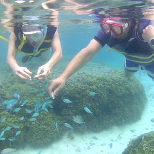 シュノーケリングは、泳ぐこと自体が久しぶりだったので緊張しましたが、飛び込んだ海がとてもきれいで開放感があったので、すぐに雰囲気にも慣れました。フィンが外れたりマスクに海水が入ったりと小さなトラブルが多発しましたが、ガイドさんがすぐ近くを泳いるので、迅速に対応してくださいました。お魚はたくさんいるのですが、餌付けされている感じがあって、自然の海とは少し違ったのかなと思います。
