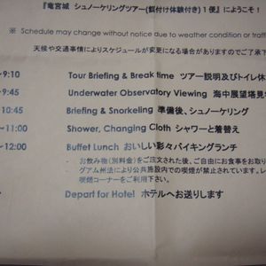 海中展望塔とイルカウォッチング、シュノーケリングのツアーを申し込みました。フィッシュアイマリンパークにつくと、イルカウォッチングのためのバスの乗換を案内していただきましたが、そのバスが間違い?とかで降ろされ、次のバスに乗り、受付のようなところで待ちぼうけ。やっと案内されたと思ったら、シュノーケリングを先にしてくださいとフィンやゴーグルを無造作に渡され何の説明もありませんでした。(HPでは日本語による丁寧な説明と書いてありましたが)シュノーケリングのできない幼児にはのぞきメガネを貸していただけるとのことでしたが、実際にはありませんでした。シュノーケリングが終わるとイルカウォッチングに向かい(この時もバスが案内されるまで受付でずいぶん待ちました)、こちらはイルカを見ることができ満足できました。しかし、その後のランチバイキングでは時間もすっかりお昼を過ぎ、バイキングも残り物?しかありませんでした。焼き立てパンケーキ?などどこにも見当たりません。途中途中で撮影していただいた写真を購入しましたが、シュノーケリングの時には集合写真を撮っていただけず(ほかのグループの方はありました)残念なことばかりでした。結局海中展望塔へも案内していただけず悲しい一日になりました。決してお安くないお値段で、待ち時間ばかり長く、これらの対応は本当に残念でした。次のグアム旅行の時には別の会社を利用させていただきます。