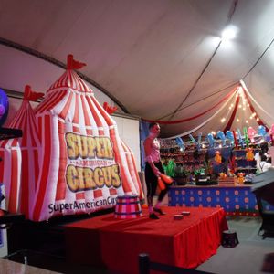 PICホテルの敷地内ですが、看板が出ているので他のホテルから来た自分でもすぐに場所がわかりました。多くはないですが、テント内にいくつか店舗も入っていて、ショー開始までの間にビールやポップコーン、お土産も買える様子です。ジャグリングのパフォーマンスもやっていました。