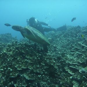 ハネムーンでグアムに訪れダイビングしました!!当日、連絡の行き違いと待ち合わせがうまくいかず午前中の部だったのに出来なくなり諦めかけていたところ「午後からなら」と言ってくださり午後からの部でお世話になることができました!ダイビングをすることが目的のハネムーンだったので凄く嬉しかったです^^。ダイビング中も耳抜きがうまく出来なくってご迷惑おかけしてしまい申し訳ありませんでした…。素早く対応してくださり助かりました。ありがとうございました。本当に海の中は綺麗で感動しました。また、ダイビングでウミガメに会えたらなぁ…とふんわり思っていたのにウミガメに会えました!!確実に会える!とは言えないと言われてたので本当に嬉しくって!!感極まりました!!!