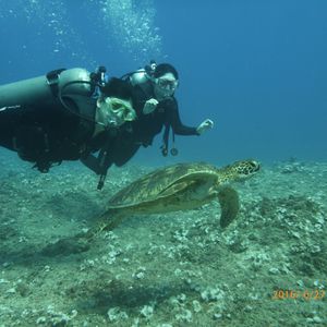 ビーチダイブでは練習、ボートダイブでは沖までいってウミガメと記念撮影!