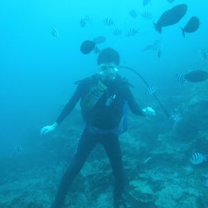 最初は、ガスボンベをしょって軍隊みたいと思ったが、8歳の子でもしょってると聞いてやる気が出た。市川さんの潜水法の教え方はおもしろかった。潜ったら、魚がめちゃいて、展望台の下に人がいてびっくりした。途中で勝手に上に行こうとしたり、フィンが飛んでいったりして申し訳なかった。次回は強いフィンが欲しいと思った。写真やビデオをいっぱい撮って下さったにもかかわらず、カメラに目線を合わせずごめんなさい。最後に撮ってもらった写真やビデオを見た時、笑いが止まらなかった。運転してくださった方に教えてもらったビールは、ばりうまかったです。