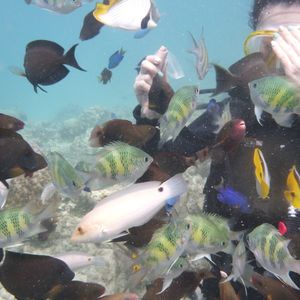 ビーチダイブではエサを持ってるだけで本当にたくさんのカラフルな魚が集まって来ました!