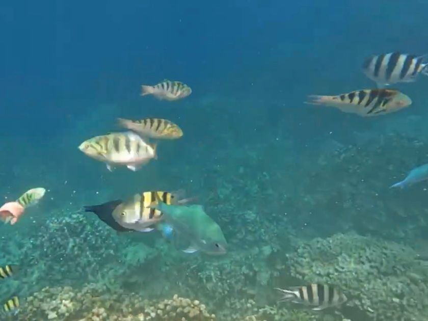 一緒に海に入ってくれるスタッフさんについて行くと餌をまいて魚を集めてくれます。私たちは遅れてしまったのであまり見られませんでしたが、近くで見ることをお勧めします。時々サメも来ていたようです。
