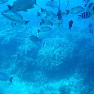 口コミを見て、楽しそうだったので参加しました。当日は風が強かったですが、お天気もよく、期待通り、お魚がたくさん見られました。餌のいかをもらって、魚にあげるのが楽しかったです。透明度も高く、海の底までよく見えました。また、グアムに行くときは、参加したいと思います。