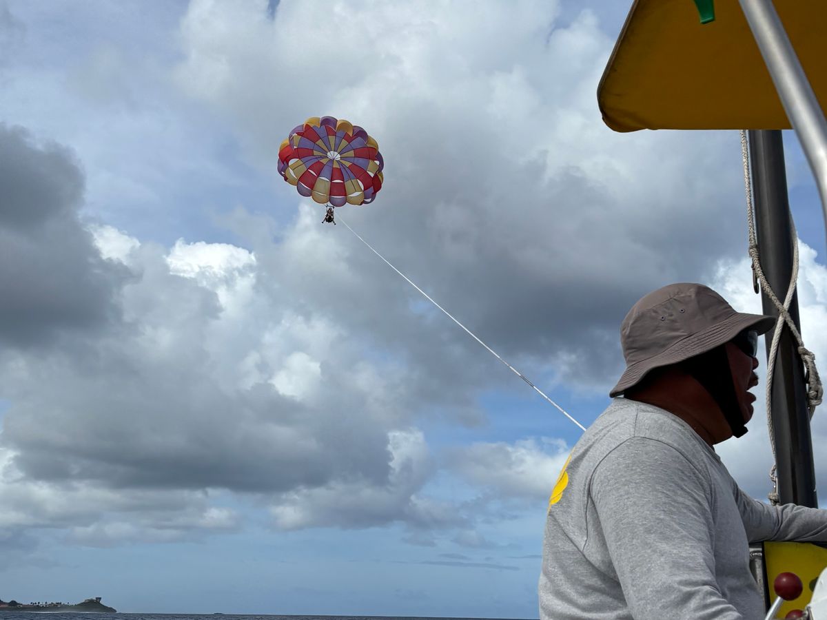 パラセーリングは大体1人3分程度で、3人の場合は誰か1人が2回乗ります。私たちは3人で、もう2人の方と同じボートに乗って移動しました。