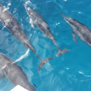 7月末、初グアムへ。朝、ホテルに迎えに来ていただき30分ほどで船場へ到着して、船にのりました。日本人家族三組でした。海亀は船から何匹か優雅に泳いでいるのが見えました。イルカは昨日は見れたけど向こう一週間見れてないのでどうかなぁて感じでした。船長さん必死に探してくださってましたが見つからず。あきらめて海亀ウォッチングへ、船から深い海へ降ります。五歳の息子には怖くて無理でした。シュノーケリングで海に潜ると想像以上の数の綺麗な魚がいました。綺麗な海を堪能していると、他の船から無線が入りイルカがいると言うので急いで船に乗り込みました!会えました!イルカ達!船の横を一緒に泳いでくれます。親子イルカも見れました。感動。可愛くて子供たちも大興奮。いい思い出になりました。その後は時間の許すかぎりまた海亀ウォッチングを楽しみました。船長さんも陽気な方で冗談を言って盛り上げてくれ楽しかったです。