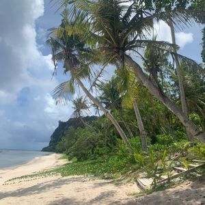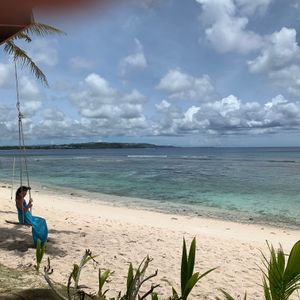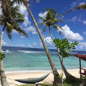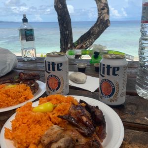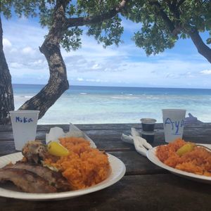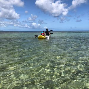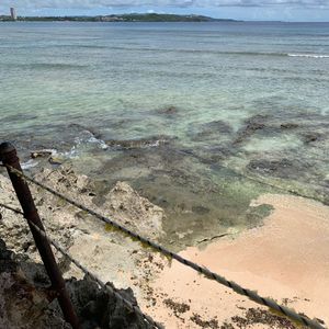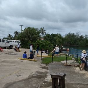 そしてまた車に乗り、一時間ほどかけて、ファイファイビーチへ向かいます。車を降りてビーチまで少し歩きます。少し険しい場所もありますが、ビーチサンダルの5歳の子も歩けるくらいです。着いたらすぐにチャモロ料理のランチです。黄色いご飯と骨つき肉。少し辛くて子供たちは食べれませんでした。冷たい水は飲み放題です。ジュースやお酒は販売してました。日本語ぺらぺらの現地の方がいろいろ説明してくれますので、安心でした。ヤシの実のジュースを飲ませてもらい、家族ごとに順番に海、洞窟、バギーと回って遊びます。ビーチは砂ではなくサンゴでゴツゴツしてます。(マリンシューズを貸してくれます。)浅くて波も穏やかです。海の中にはかわいい綺麗な魚がいっぱいいました。5歳の息子が魚に足を噛み付かれてもう入るのが嫌だと言うので、ヤシの木のブランコやトランポリンやカヌーに乗って 遊びました。中学生の兄達は潜って遊びたかったと不満をもらしてましたが(浅すぎて 潜れませんでした。)午前中はアクティブに午後から は のんびりと過ごせる楽しいツ アーだと思います。
