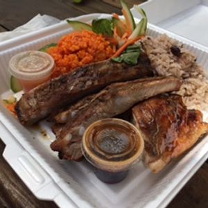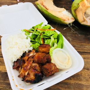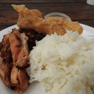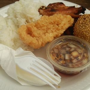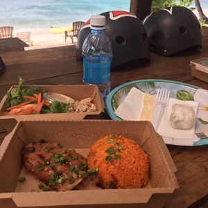 昼食はハワイでよくみるプレートランチ。チキンとポークのBBQスタイルでとてもおいしかったです。(前日のシェラトンのBBQより上)