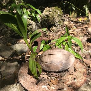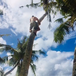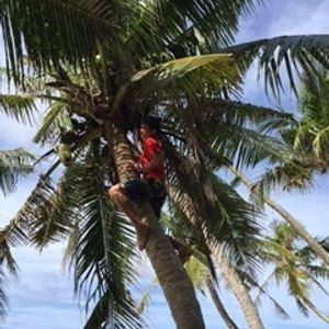 「ヤシジュース飲みますか?」ときかれ「はい」と答えたらショーンさんがいきなりヤシの木によじ登りって実を落とし、それを斧で割って飲ませてくれました。これが美味し!