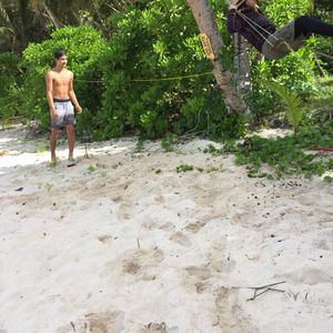 ホテル街から10分ぐらいの場所にあるプライベートビーチですがグアムの大自然が残っていて結構な山道かもしれません。スニーカーや底の厚いマリンシューズで参加されるのがおすすめですね。レンタルのありますが・・本当におしゃれではないです(笑)ちょっと不便ですがヤシの木のジュースを飲んだり自然に触れるのも日本ではあまりない事なので楽しい思い出になると思います。