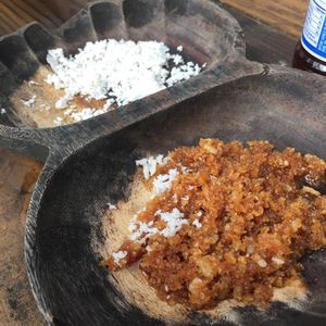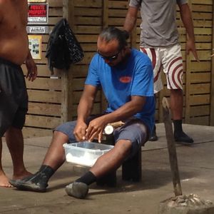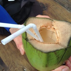 このあとは、ランチ!炭火で焼いたチキン、大盛りのサラダ、お腹いっぱいでした!おかわりもできましたよ!ソーセージはイマイチだったので、チキンはおかわりしました!味付けもよくて、すすみました!ビールは別料金で5$。缶ビールです。割高だけど、リゾートで飲むビールは格別でした!ランチの後はヤシの実を割ってくれて、1グループに1ついただきました。水に少し味がついたような、感じ?おいしくはなかったですが笑、これもまたいい思い出でした!