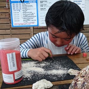 親子で星の砂探しをしていたら、いつのまにかスタッフも隣で集めていて、あげるよ!と渡してくれました。