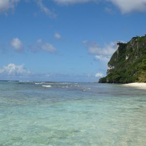 そこを抜けると目の前には白い砂浜と前方にはグアム島歴史的観光地の恋人岬が・・・