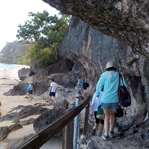 大雨の日で行きのお迎えのバスの中はお通夜みたいな雰囲気でしたが、現地に着いてみたら少し晴れてきて、やや険しいけど景色の良いビーチまでの道のりでテンションが徐々にあがり、ビーチについた頃には曇り空と小雨の中でもとてもきれいな景色に気分は晴れやかになりました。水着でいるのは寒いかと思いましたが、意外にそうでもなく、アウトドア派ではない私でもしっかり海で泳げました。シュノーケリングはおもったほど魚さんたちが来てくれませんでしたが、そういう日もあるのでしょう。シャワーが温水でないと知っていたので不安でしたが、冷たく感じることもなくまったく気にならなりませんでした。降ったりはれたりの不安定なお天気の中でしたが、ココナッツのおもしろコーナーやダンスショーなどスタッフの皆様の多大なるおもてなしにより一日とても快適に過ごせました。6歳の息子もがっつりビーチを満喫できたようで一日中はしゃいでいました。最後の洞窟は想像以上に険しい岩山を降りたりのぼったりするところで私にはかなりの冒険で、楽しかったです。ありがとうございました。