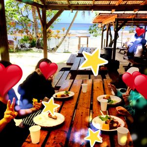 ビーチに着くまでの道のりも探検のようで楽しく、ココナッツの削りたてを食べさせてくれたり、ダンス体験や洞窟探検にこどもたちは喜んでいました。シュノーケルやマリンブーツ、ライフジャケット、カヤックも使用でき、色とりどりの魚への餌やりも夢中でしてました。好き嫌いの多いこどもですが、おいしいと言って食べてたので助かりました。