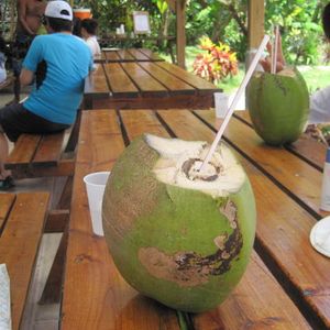 到着後すぐにシュノーケルをしましたが、思った程沢山の魚ではありませんでした。でも、午後からの餌付けツアーでパンを撒くと沢山寄って来ました。その後、洞窟探検に参加しました。生い茂ったジャングルの中を進んで行くと洞窟の入り口があり、中へ入って行くと真水が流れている小さな川があり神秘的でした。また、ジャングルの中を進んで行くと椰子の木に沢山の実がなっていたので、案内してくれたスタッフが椰子の木に登って椰子の実を10個位もぎ取ってくれました。取れた椰子の実は1人1個ずつ海辺沿いを持ち帰り、午後のおやつに椰子の実ジュースとし皆に配られました。昼食はお皿にご飯・BBQ・生野菜を入れてくれます。お代りも出来ます。水は1日中飲み放題です。昼食が済んだ頃にポリネシアンダンスショーが始まります。私がトイレに行って戻って来た頃には終りかけていたので、7分位の短いものでしたが、その後ダンサーに多くの人が誘われて、舞台でダンサーと同じ様に皆一緒に踊るのです。その後、上手だった人が、ダンサーからひっぱり出されダンサーと踊ります。それが終わると、椰子の実の皮むきや、椰子の実ジュースを飲んだり、椰子の実を食べたり、葉っぱで魚の作り方を教えて貰ったりして、1日中が盛り沢山で飽きる事無くとても楽しかったです。
