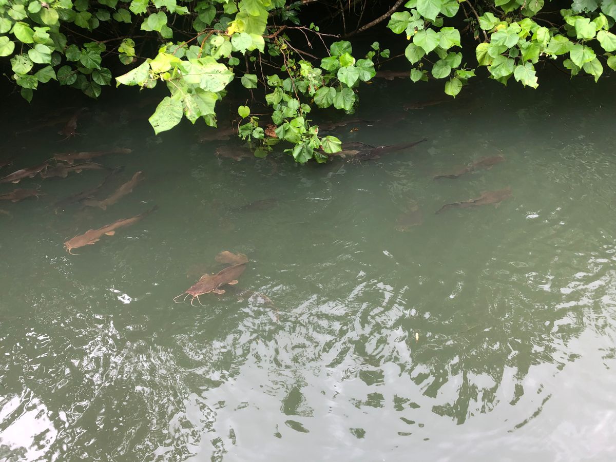 カニやナマズや大きな魚が出てくると船を止めて、パンを投げると凄い勢いで食べて行きます。針で釣るとすぐに釣れる釣れる。子どもたちと夢中に見てました。