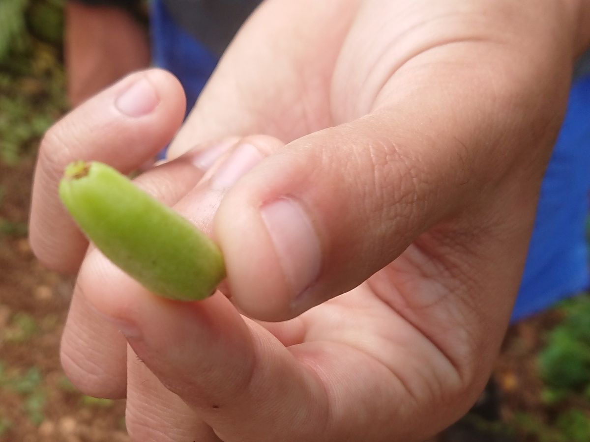 目的地に車を停めると、ほんの数メートル行ったところにジャングルの入口が。しばらく平坦な道を進み、坂を下り、少々急な岩場を降りると洞窟の入口。道中には写真の木の実があり、食べさせてもらいました!これがまた酸っぱくて美味しい(*´ч`*)