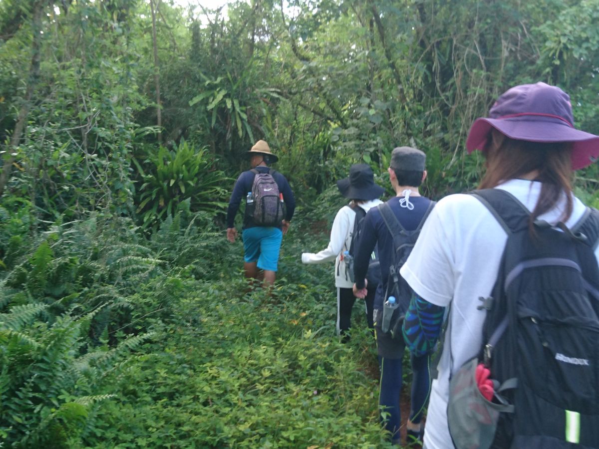 行きと帰りでほとんど同じ道でしたが一部違うところも歩いたかな?日陰がないところも歩くので帽子はあった方が、足場も草むらを歩くので長ズボンとかのが良いと思います。私は水着+ラッシュトレンカ+ズボンという重装備だったので草むらは全く問題なかったです。ただ着すぎてて探検終わった時点では水着だけ半乾き状態でした。(最後ホテルに送っていただいた後に外で数分日向ぼっこしてたらすぐ乾きましたが)