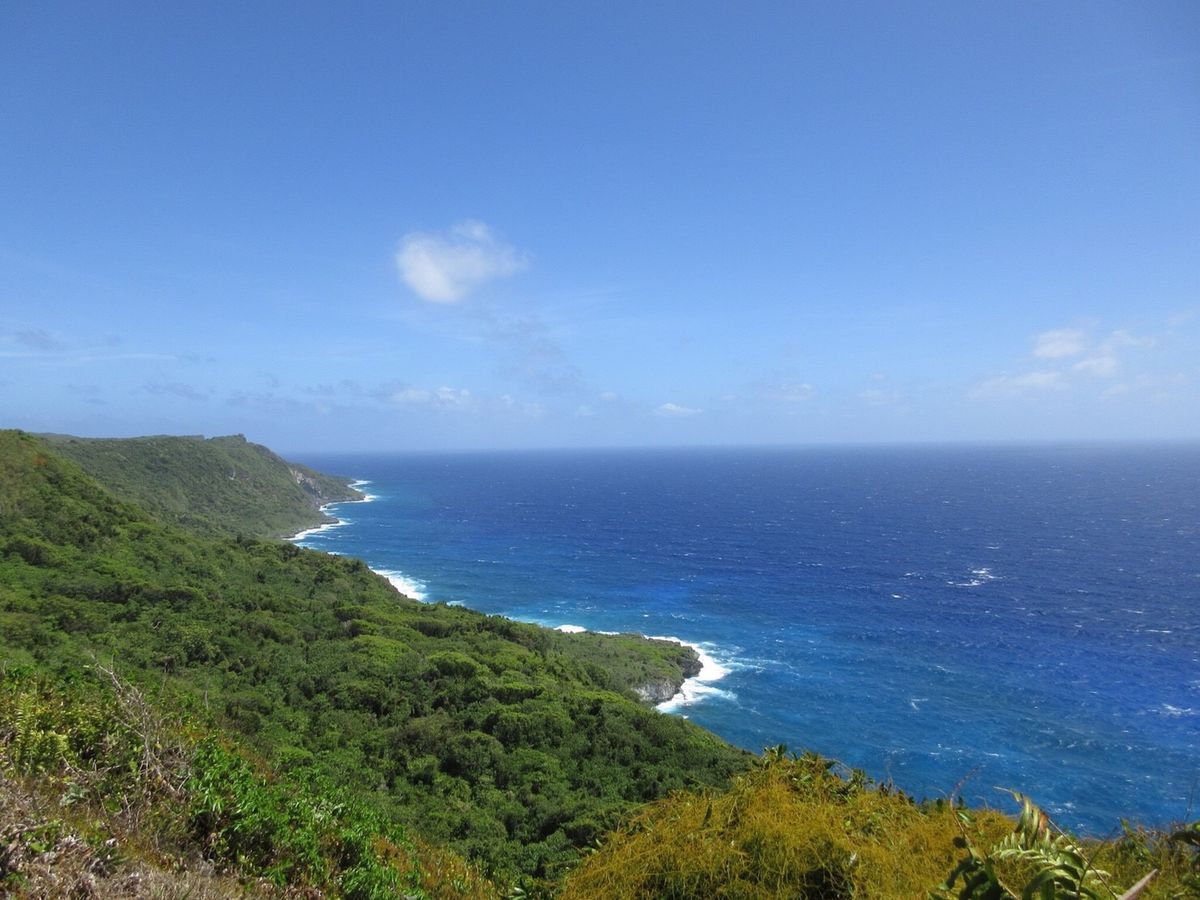 洞窟を抜け、古代チャモロ人が使っていた石臼などの遺跡を見ながら歩き続けた先には…信じられないほど美しいブルーの海が広がっていました!!まさに絶景です。
