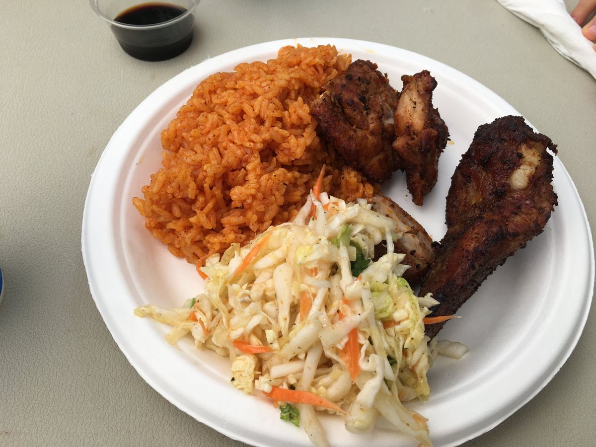 ランチはワンプレートにスペアリブ、チキン、サラダ、ケチャップライス