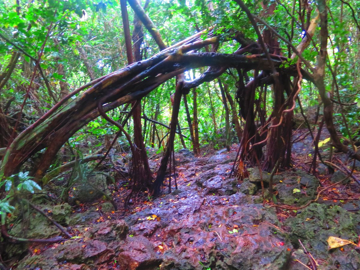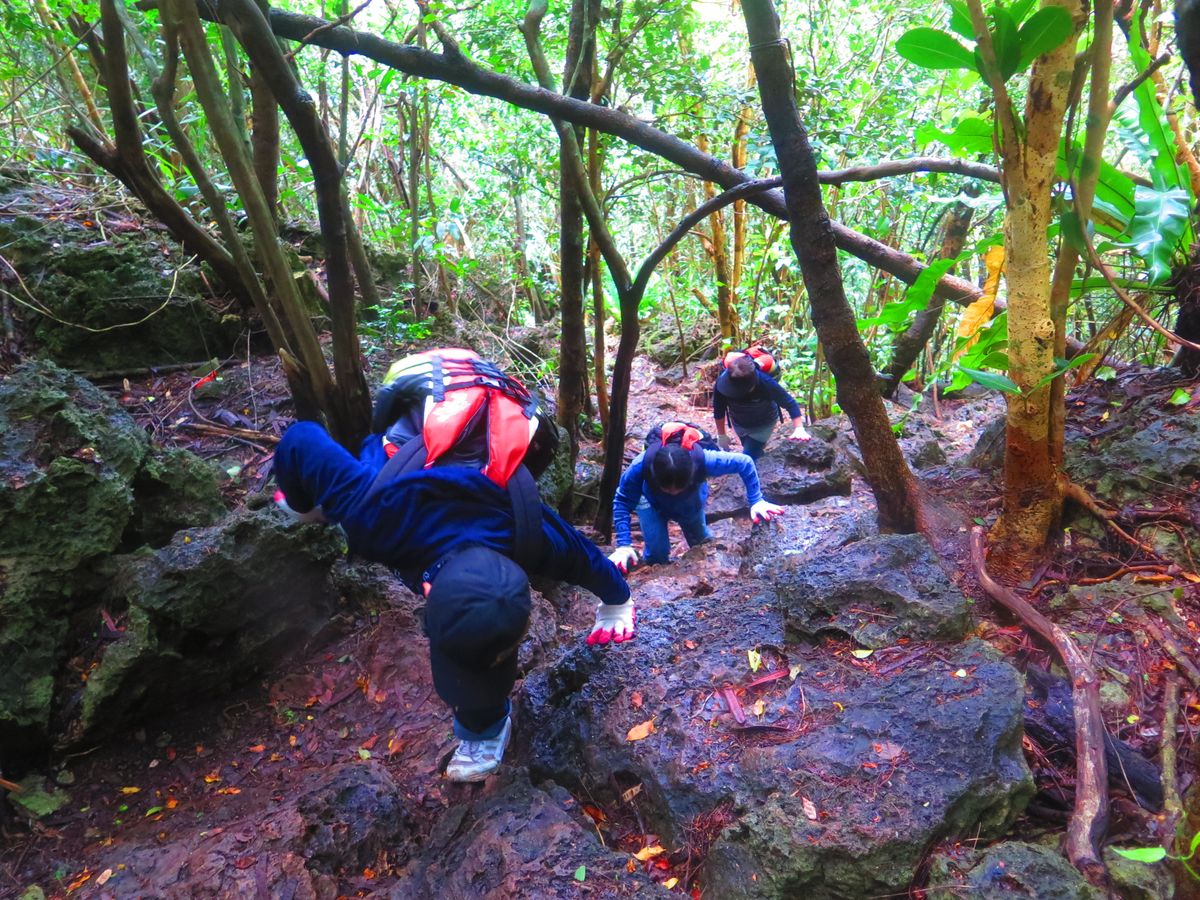 パガットケーブのトレッキングツアーに参加しました。タモン市街のホテルからピックアップしてもらい、車で1時間ほど走るとジャングルの入り口に到着しました。ガイドさんは現地(チャモロ人)の方でしたが、独学されたという日本語はとても堪能で、不自由なく案内頂きました。