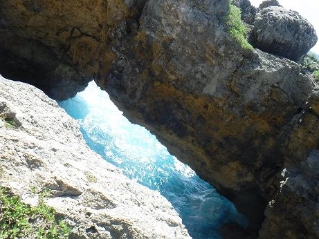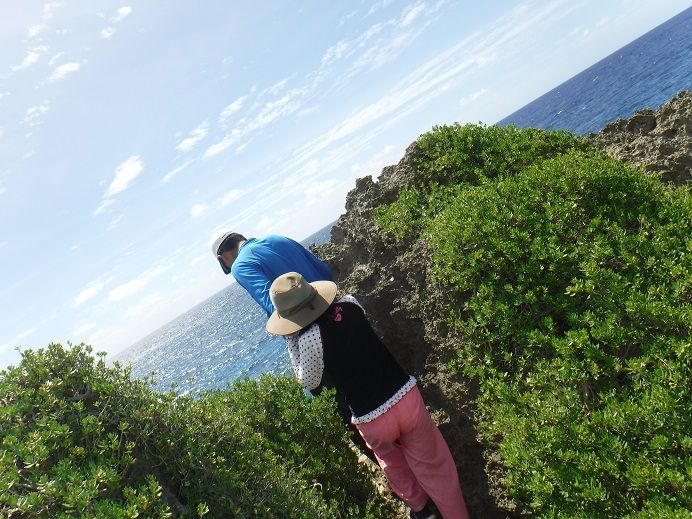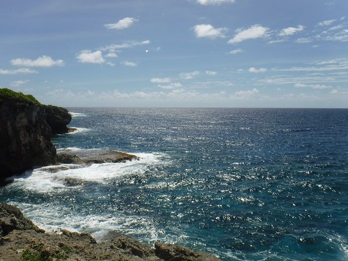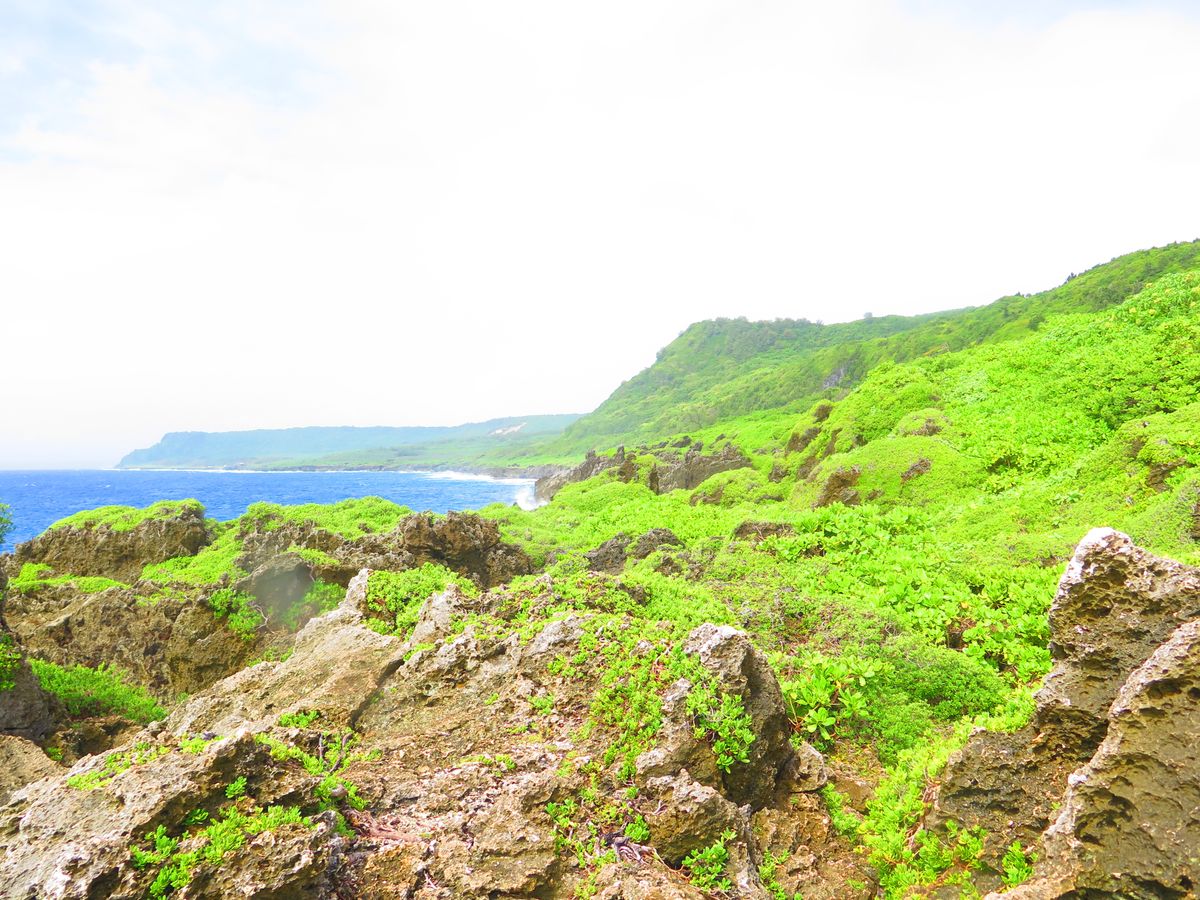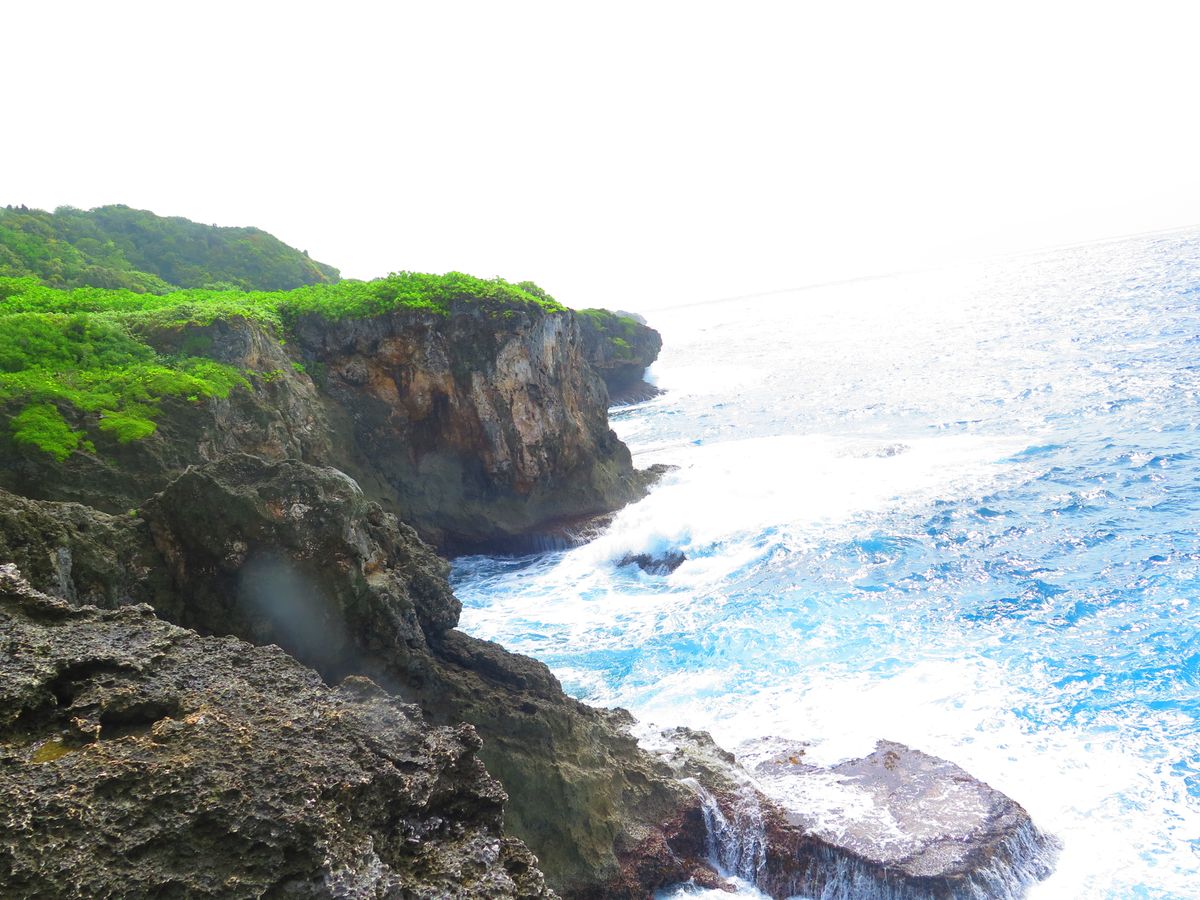 洞窟で30分ほど遊んだ後は、再びジャングルを少し進み、断崖絶壁の海岸に出ました。風が強く、波が強く打ちつける海岸沿いの岩の上で、ガイドさんが配ってくれた昼食(おにぎり)を食べながら休憩です。ガイドさんは水面に顔を出すウミガメを指さして教えてくれたり、チャモロ料理が美味しいオススメのレストランを教えてくれたのがとても良かったです。一部、ガイドさんの助けを借りて岸壁スレスレのところを進むので、高所恐怖症の人はやや辛いかもしれません。。