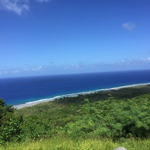 折り返し地点となった小高い丘から眺めた緑の森と真っ青な海は絶景で思わずその景色をバックに二人だけの写真を取って貰いました。