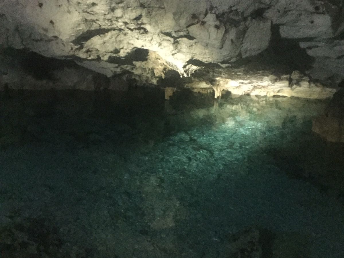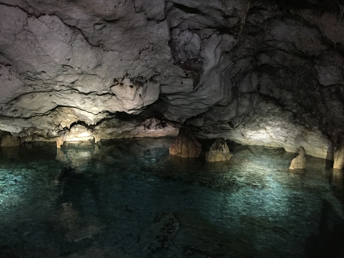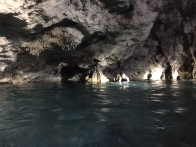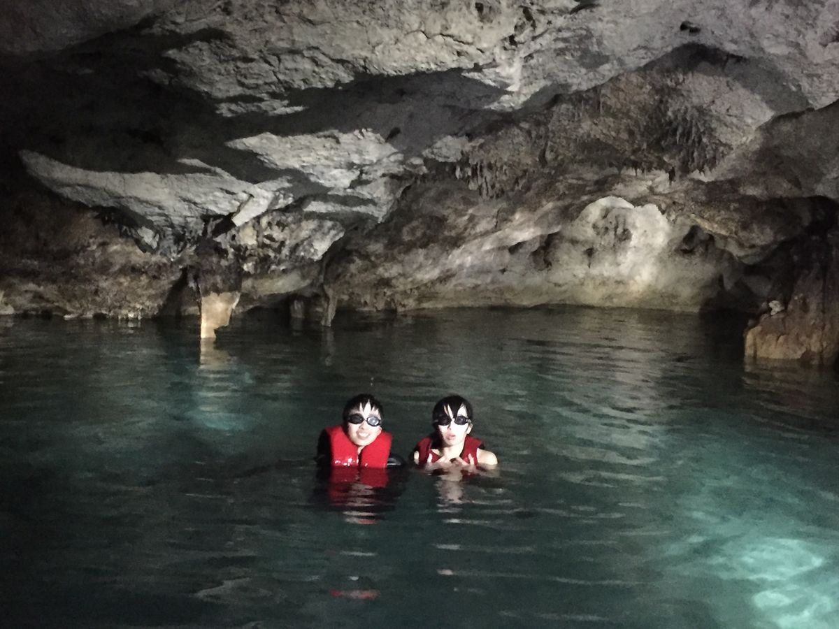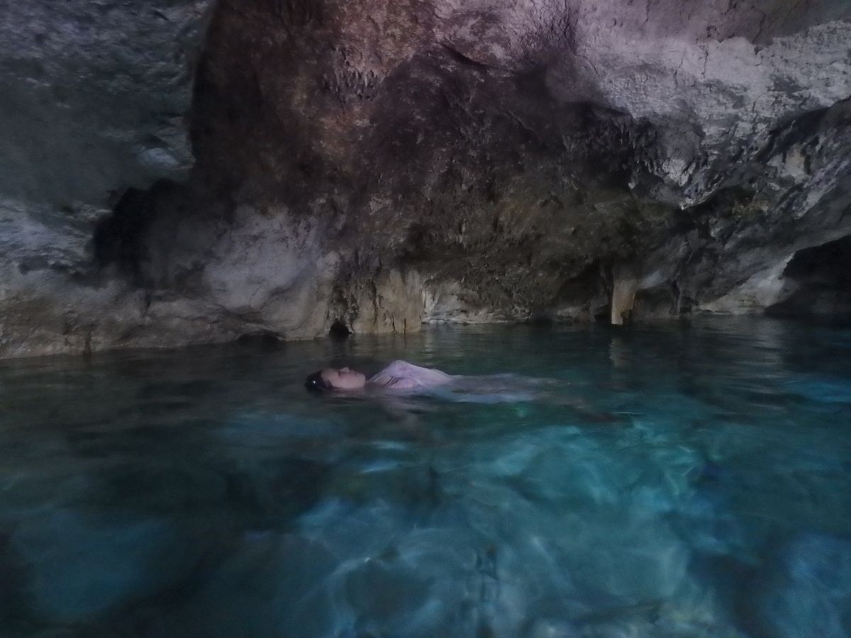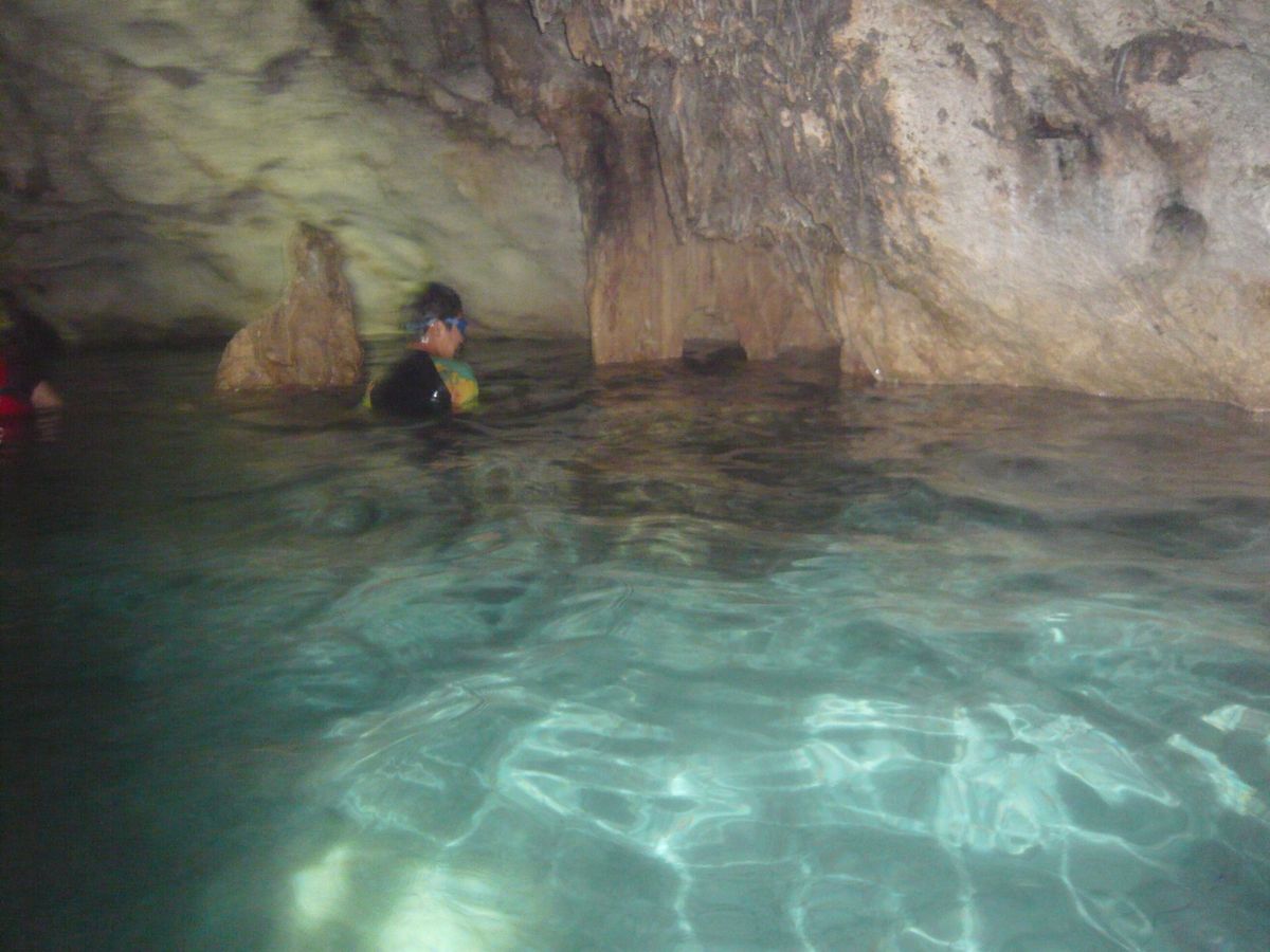 洞窟の水はすごく澄んでいて底が見えるので、深くないのかと思いきや、一番深いところは180センチくらいありました。ゴーグルをつけて泳ぐと、暗がりながら隅々まで見えるほど透明でした。こんな神秘的な洞窟で泳げるなんて、本当に素晴らしい体験でした。洞窟では結構時間を取ってもらって、ゆっくりと泳いだり潜ったりすることが出来ました。