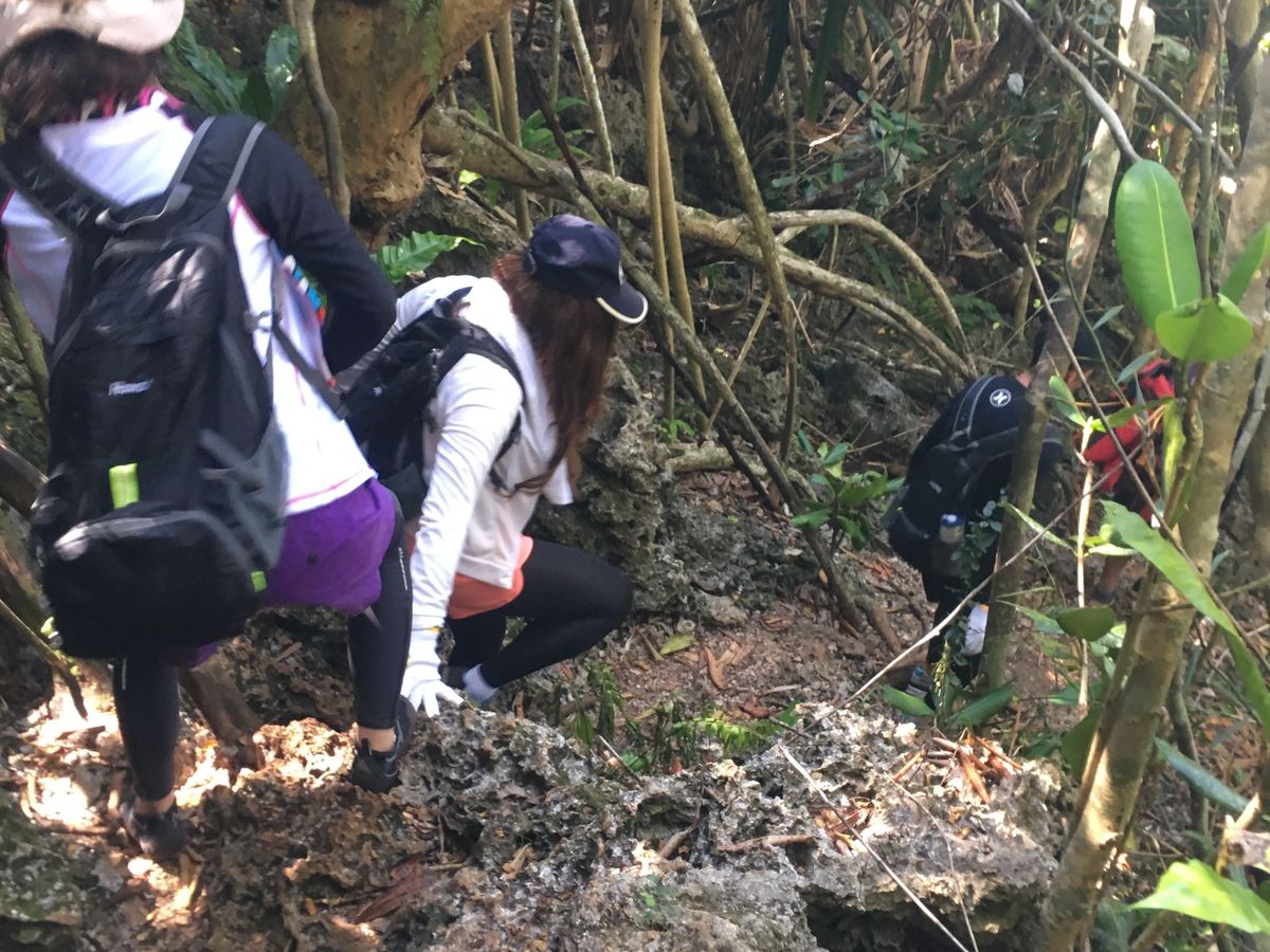 道のりは、ごつごつした場所があったり、段差やちょっと坂があったりと、多少足場は悪いところもありましたが、周囲の植物の説明で立ち止まったり、休憩をはさんでもらったので、それほどしんどさは感じなく洞窟に到着しました。