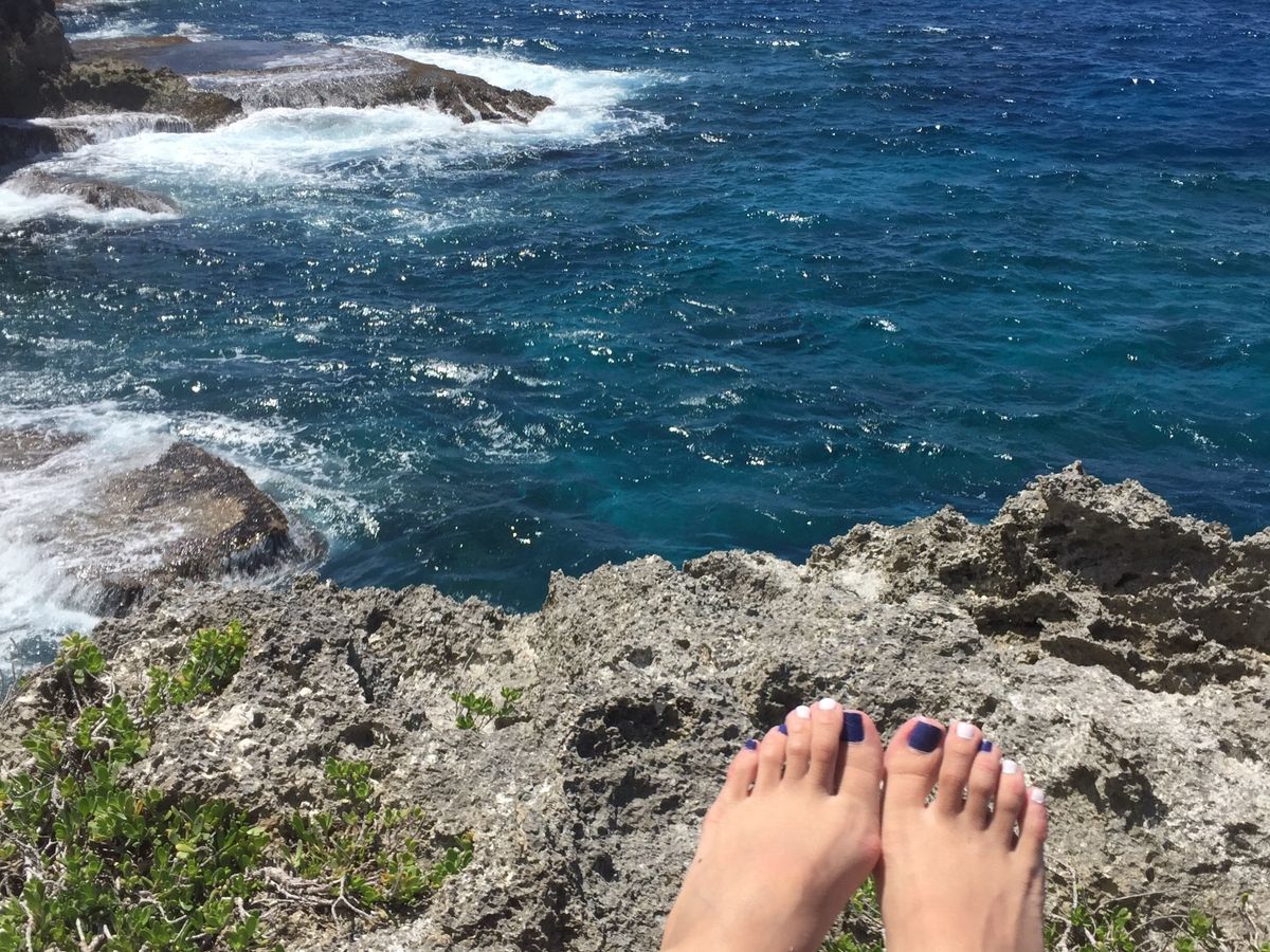 そのあと、海辺まで歩いてランチタイム。サスペンスドラマに出てくるような断崖絶壁で、濃度の違う青色の海を眺めながらおにぎりを食べました。このおにぎりがコンビニおにぎりの一回り程度大きいもので、具が真ん中一面にみっちり入っていて美味しかったです。