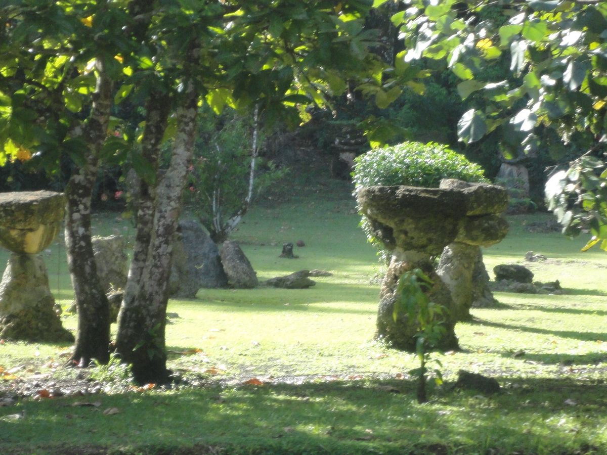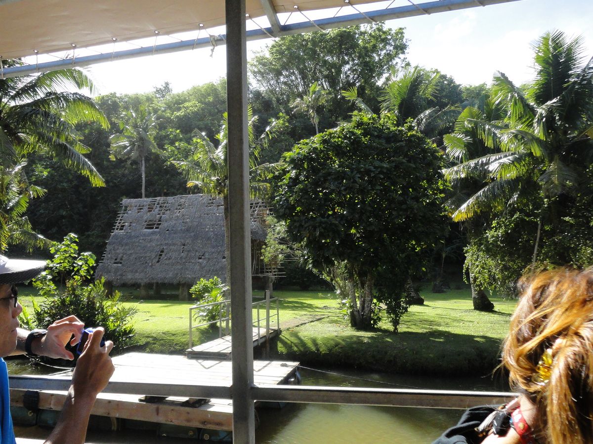 ジャングルの中は思ったほど不快ではなく、真夏の都心のほうがよっぽど暑いです。古代遺跡は、遺跡…といっても石が数個立っているのと、復元家屋だけなのでおまけに近いかもしれません。私たちはそれよりも、その周りに咲き乱れるハイビスカスやマンゴーなどの色とりどりの植物たちのほうが面白かったです。ツアーでは終始スタッフの方が陽気にガイドしてくれて楽しかったです。ツアーの最後には全員ではありませんがヤシの葉細工をプレゼントしてくれて妻が喜び…そうでした(じゃんけんに負けてもらいそこねました)