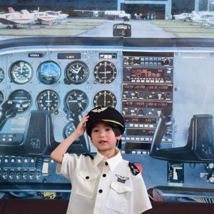 制服を着て運転できるのかと思っていたのですが、密閉されたセスナの中は非常に暑いのでおすすめしないとのこと。体験終了後、事務所内で制服を着て記念撮影させてもらいました。