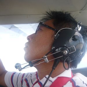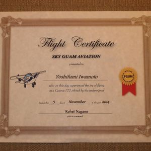 とヘッドホンから聞こえる、教官のアナウンスに、私は、空から目を動かせず、『はい綺麗ですね』と。1秒。下をゆっくり見る余裕など全くありませんでした。30分程のグアム島上空を飛行し、グアム空港が見えて来る。管制官と教官が、無線でやり取りをしながら、進入。『はい着陸しますよと、機首を下げる支持が、ヘッドホンから入ってくる。『 まさか着陸まで?』と踊ろいている間もなく、着陸の仕方を教わる。何度かハンドルを上下に動かしながら、着陸~滑走。駐機場に機体を戻してフライト終了。事務所で、ミネラルウオーターをがぶ飲みしていると、『お疲れ様です』と。フライト証明書を手渡される。スタッフの皆様の拍手を壁越しに聞きながら、なんか目が熱くなりました。この飛行機に同乗してくれた妻にも感謝です。これが私の始めてのフライトです。50歳を過ぎての初フライト。目指すものがまた見つかりました。本当のライセンス、挑戦致します。いつか一人で空を飛びたいと思いました。 ナガノ教官、本当に有難うございました。