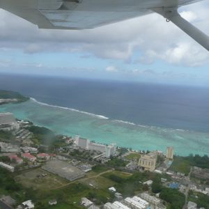 眼下に見えるグアムはとっても綺麗で、ジェット機よりも地上に近いところを飛ぶので、宿泊ホテルや恋人岬、潜水艦、空母等もよく見えてとても面白い!