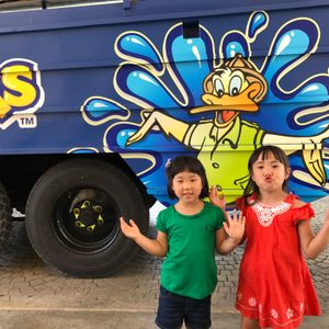 家族(10歳、4歳)と祖父母と参加しました。sandcastleの外で待っていましたが、暑く、他の参加者も外にいたのでここが集合場所かと思いきや、sandcastleの中に受付がありました。バスが到着すると子供たちのテンションも上がり、ダックの笛を吹きまくって楽しんでいました。海ではみんな運転もさせてもらい、写真も撮ってガイドさん、ドライバーさんのおもしろコンビにノリノリで参加できました。