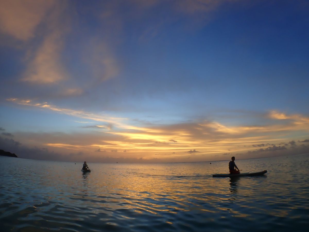 TATSUYA TOWERから5分くらいのビーチからスタート。経験に合わせて事前説明をしてもらい、最初はパドリングなどを見ながら、ビーチ近くでsupに慣れた後、崖下の洞窟やザ・ビーチなどを周り沖の珊瑚礁でシュノーケリングをしながらサンセットを待ちます。少し曇ってましたが、逆に色は綺麗でした。