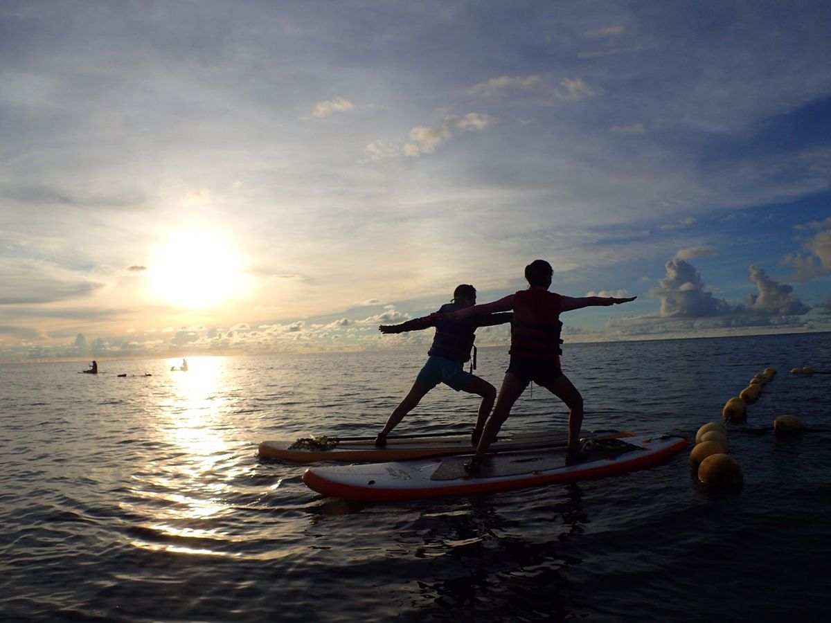 SUP初体験でしたが、カワサキさんとても教え方がわかりやすくて、なんとか立ち上がって漕ぐことができました(笑)シュノーケルもさんざと潜ってるしからな~なんてテンション低かったのですが、潜ってびつくりしました。見たことのないお魚さんも大勢いて、本当にびつくりでした。夕方だからラッシュガードいらねと思っていましたが西日も結構やけます。忘れていきましたが、カワサキさんのご好意でお借りすることができてラッキーでした。パドルの上でヨガもどきをしたりなど、波の上でとっても楽しかったです。また、ご指導宜しくお願いいたします。