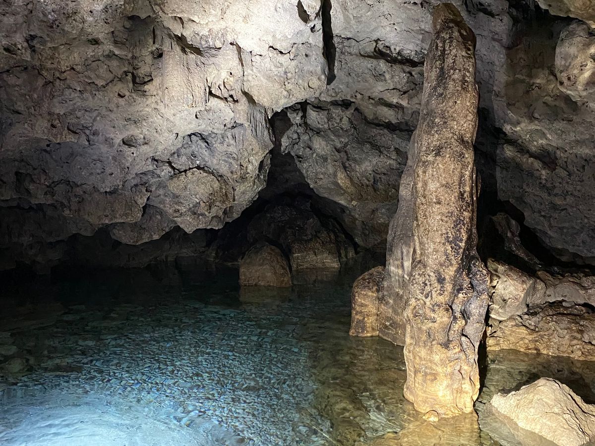 最終目的地の洞窟の水は透明度抜群で、神秘的な場所です。