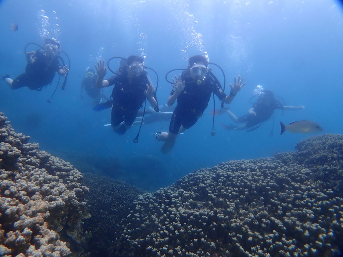 8月の終わりの台風後に、家族4人で参加しました。シュノーケルは経験ありましたが、ダイビングは全員はじめての体験でした。正直、シュノーケルにボンベが付くだけのことですが、これにより、より深く潜ることができ、海の中から見る青い水面を見るのは感動でした。また、「体験」というタイトルですが、2ダイブ(2周)あるのが良かったです。2周目は皆、より自然に海を楽しめたと思います。